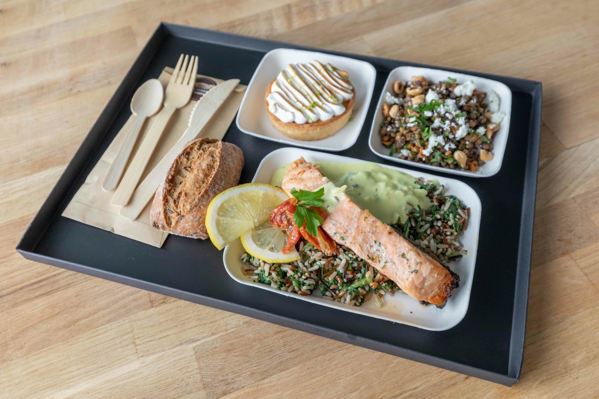 Plat : Saumon rôti, trio de riz, épinards, crème aux trois citrons